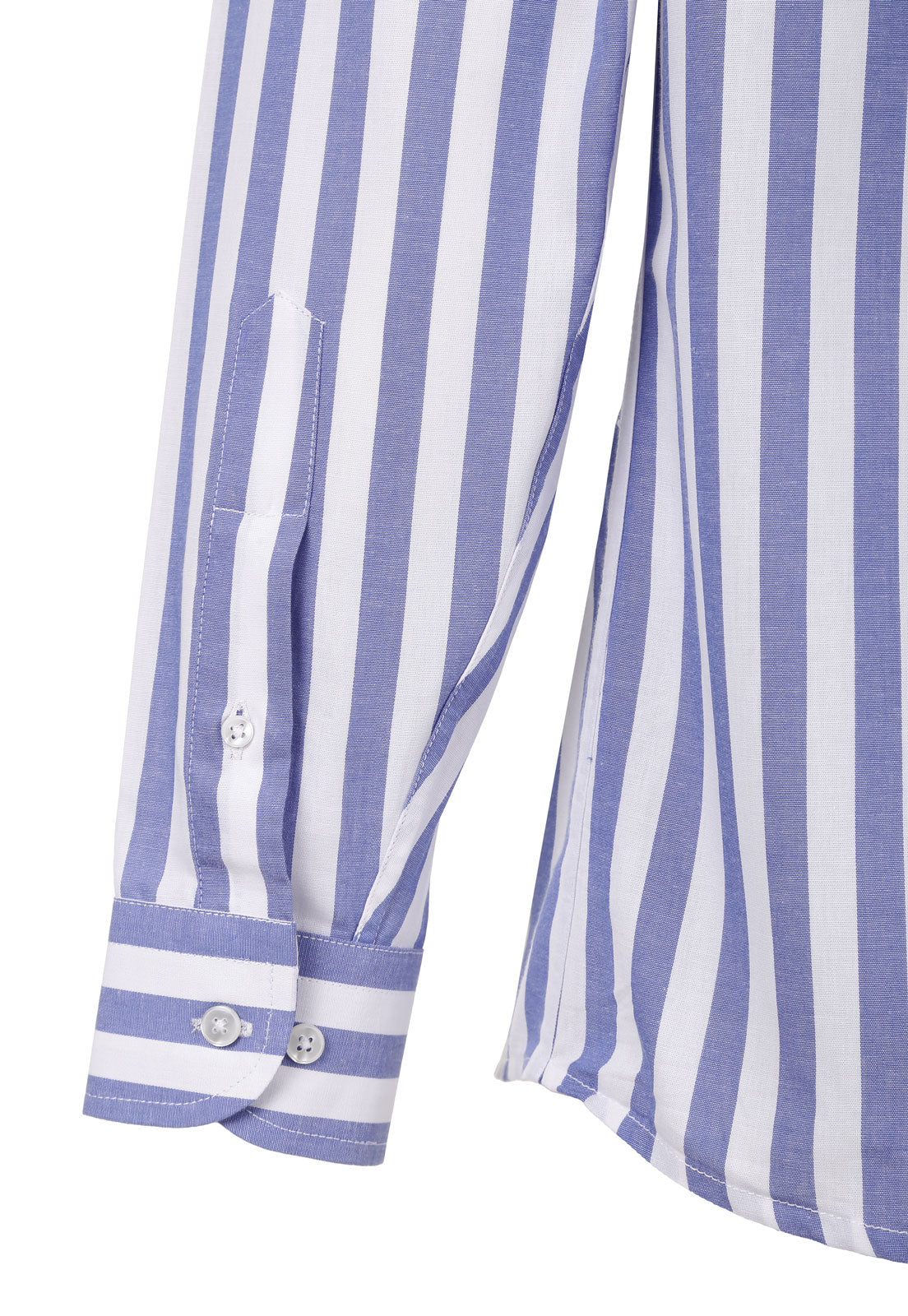 Camisa masculina de corte regular, confeccionada en algodón premium importado de Perú, ligero y fresco. Su diseño de rayas verticales azul y blanco estiliza la silueta y eleva cualquier look.