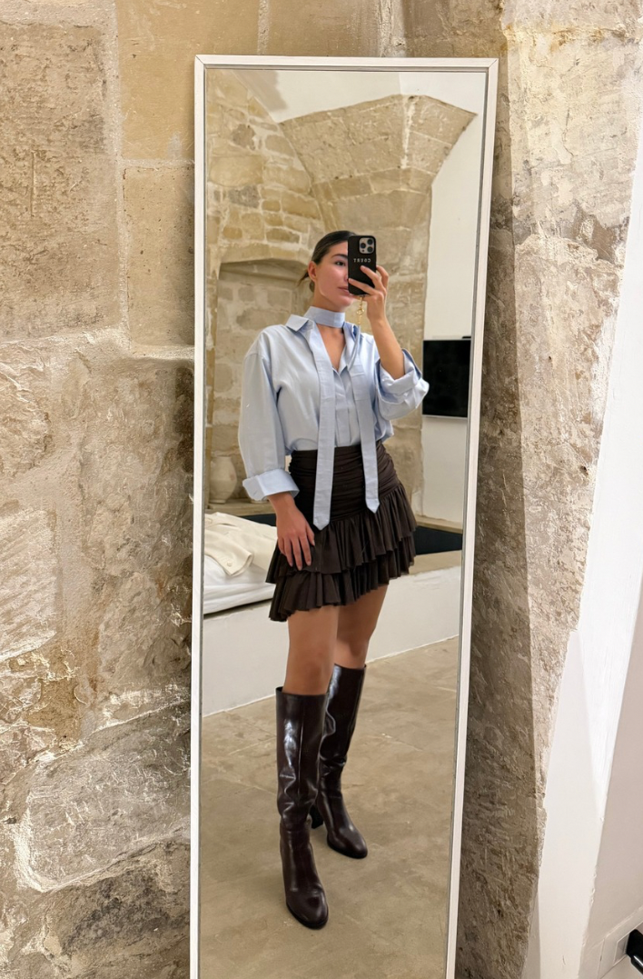 Ideal para elevar cualquier look: combínala con botas para un outfit de noche con actitud, o úsala con flats o sneakers para un estilo más relajado pero igual de icónico.