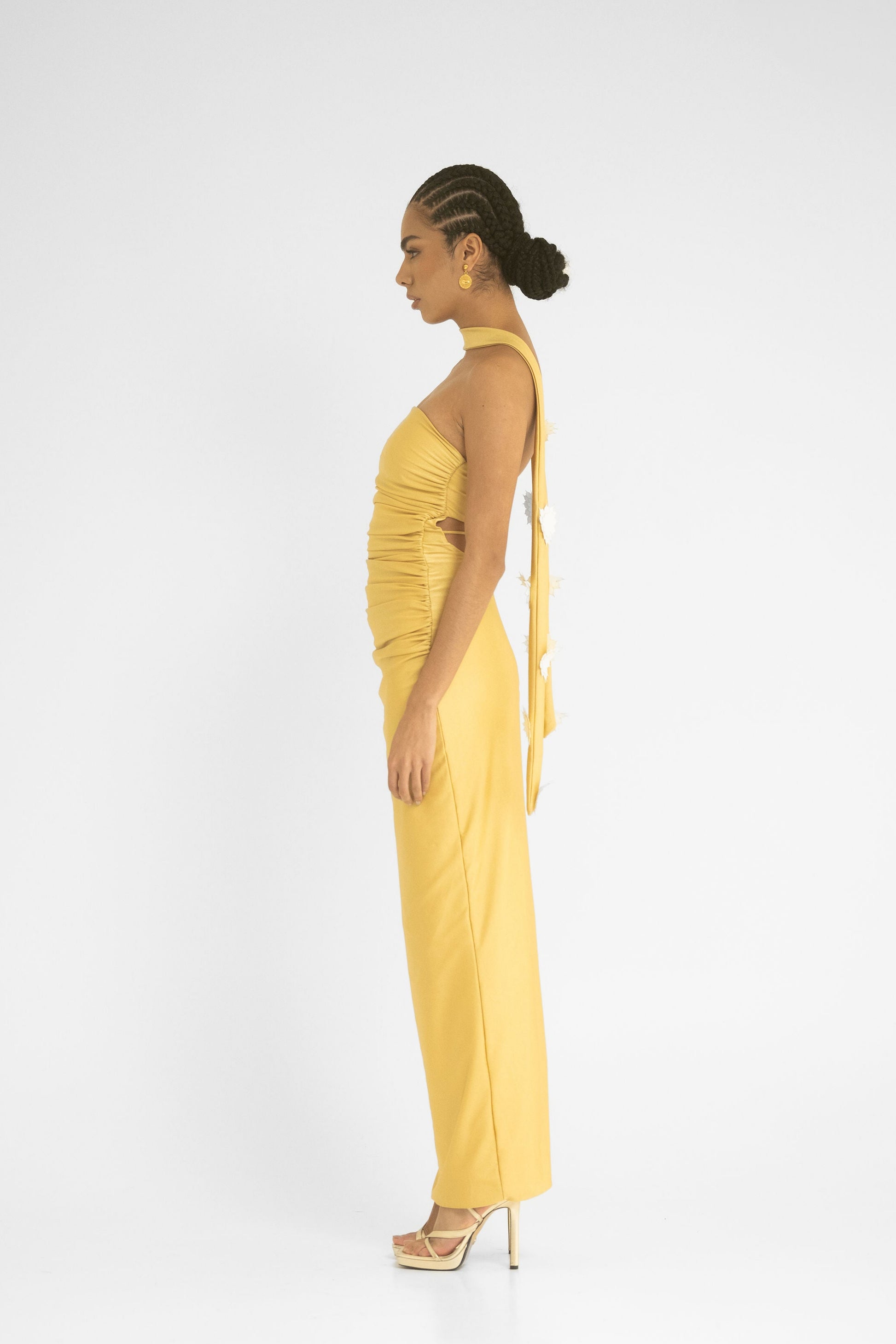El Vestido Sol está diseñado para que brilles en cualquier lugar. Su versatilidad y comodidad te permiten usarlo con o sin la estola, que lleva nuestro logo, el girasol, como amuleto para que alcances todos tus sueños. El drapeado hecho a mano en el frente resalta tu figura con un toque único, mientras que los girasoles en la estola, cortados a láser, añaden un detalle sofisticado y moderno.