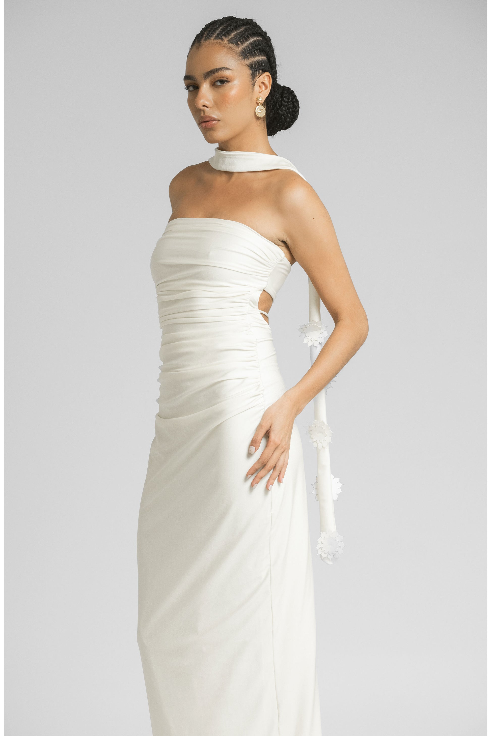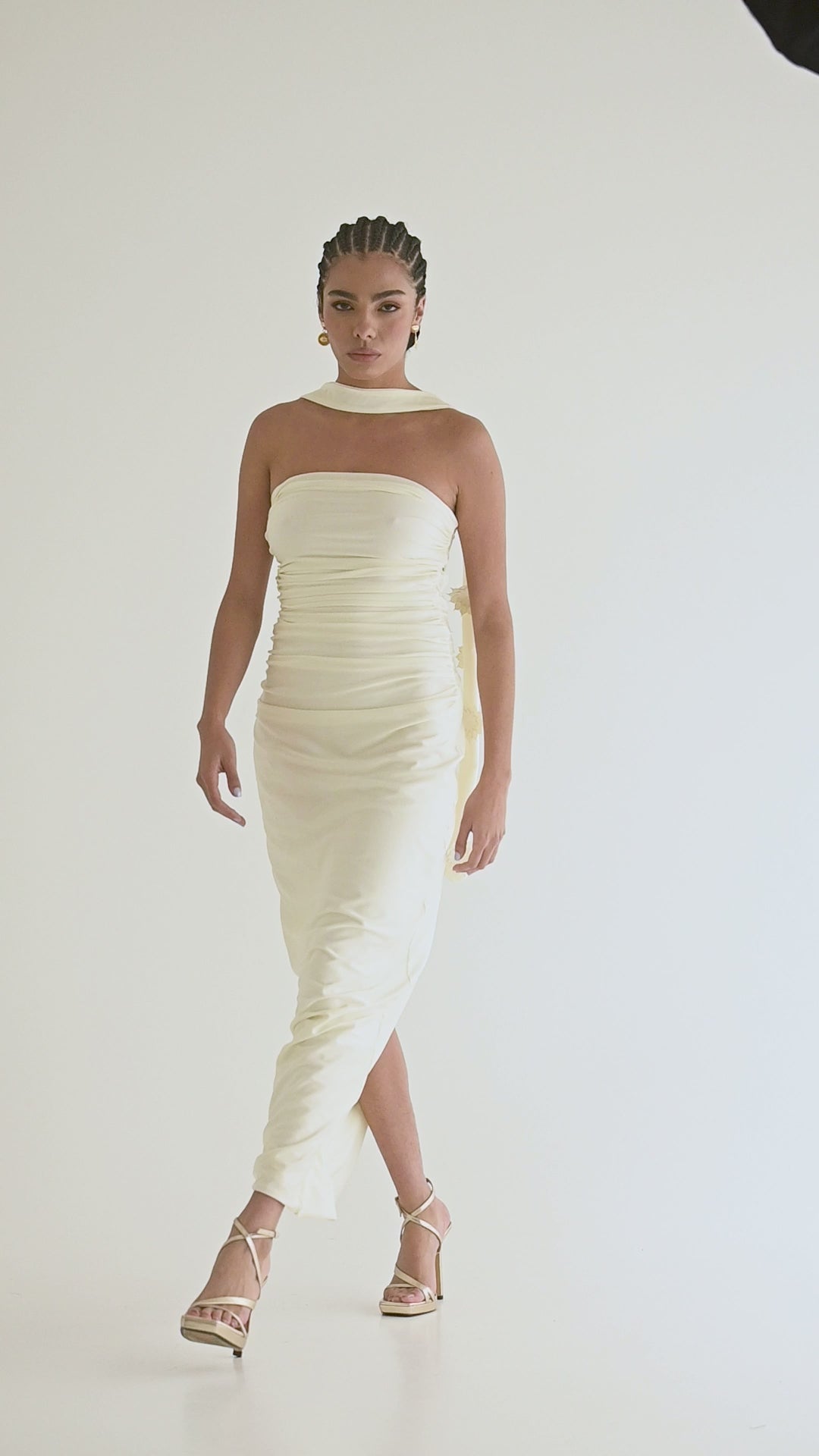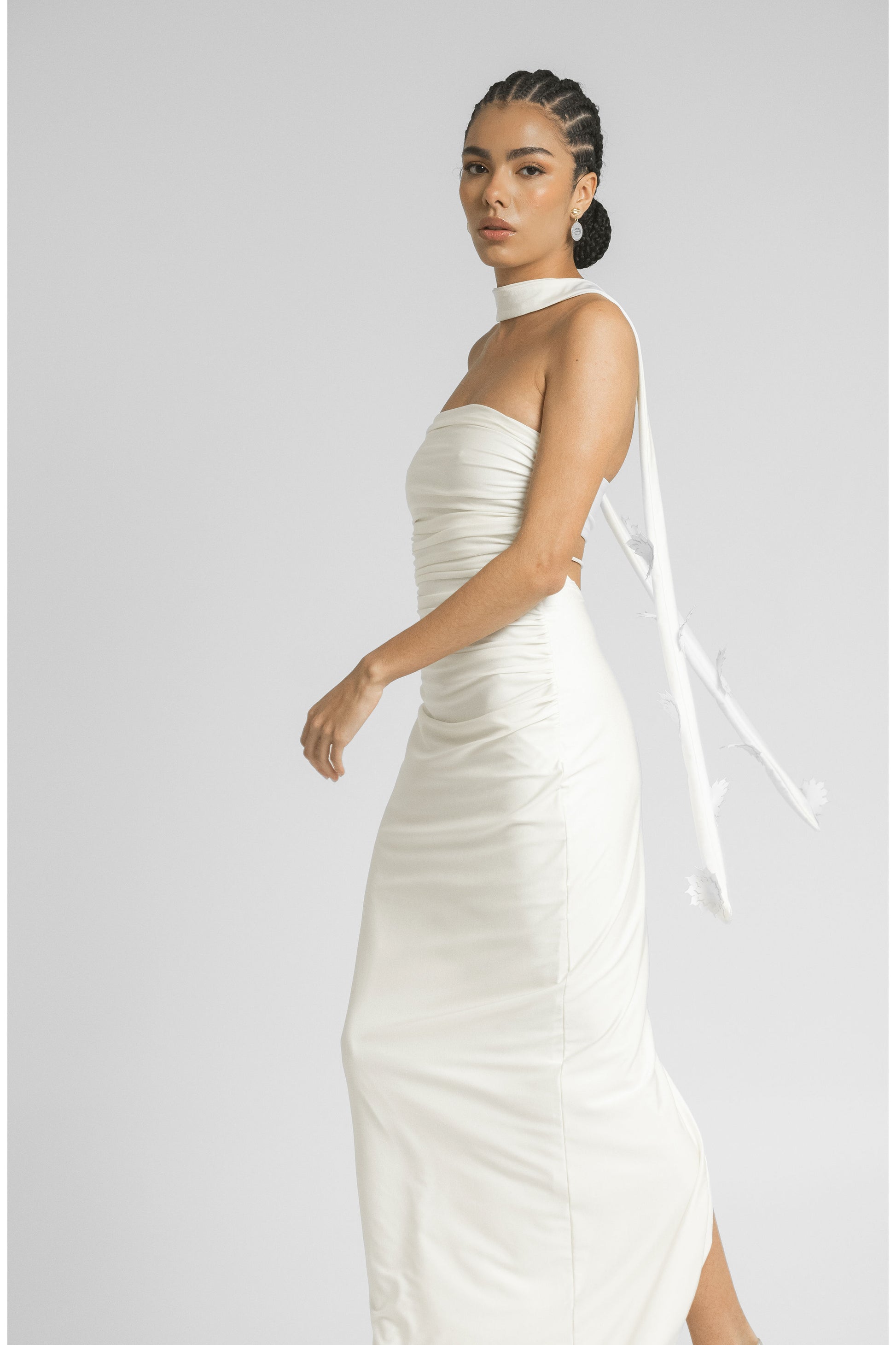 El Vestido Sol está diseñado para que brilles en cualquier lugar. Su versatilidad y comodidad te permiten usarlo con o sin la estola, que lleva nuestro logo, el girasol, como amuleto para que alcances todos tus sueños. El drapeado hecho a mano en el frente resalta tu figura con un toque único, mientras que los girasoles en la estola, cortados a láser, añaden un detalle sofisticado y moderno.
