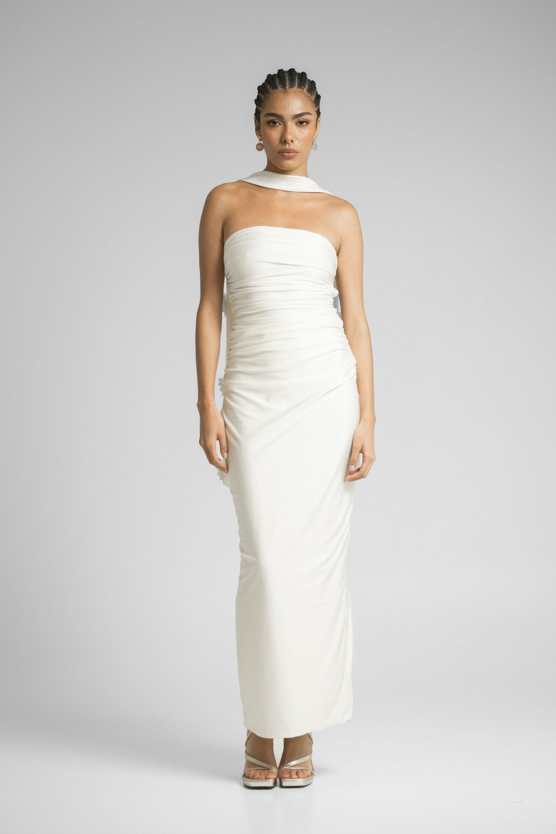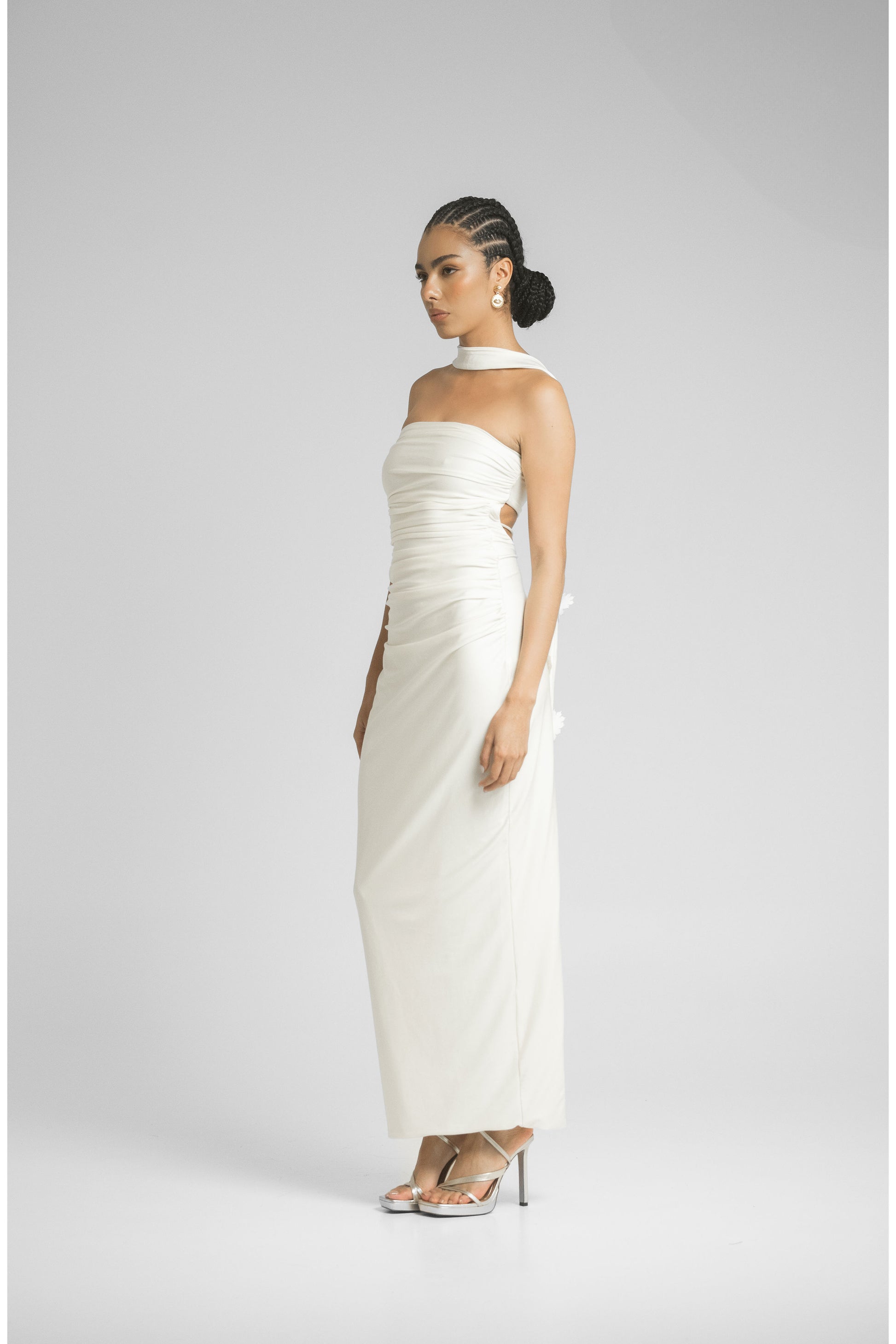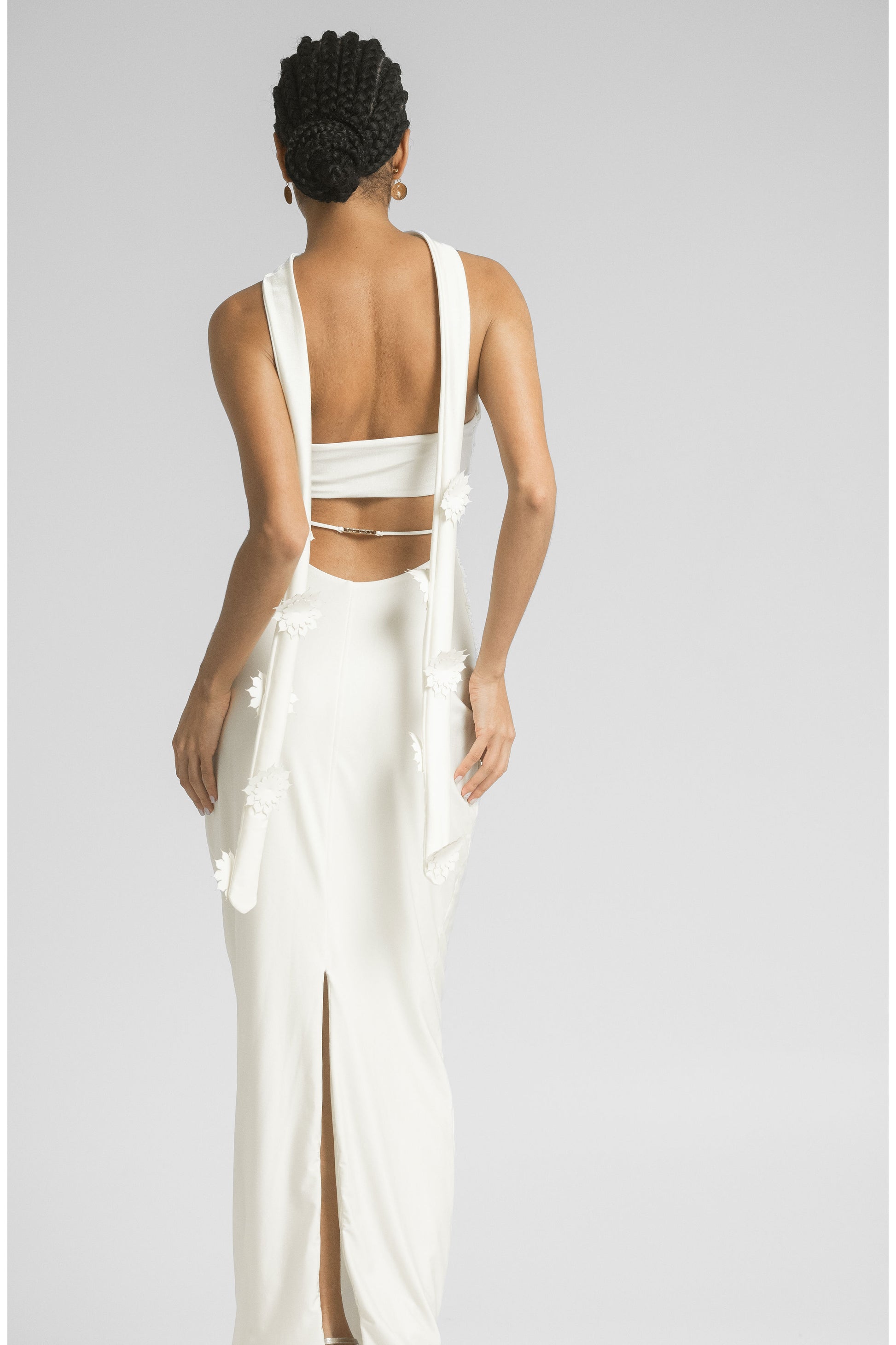 El Vestido Sol está diseñado para que brilles en cualquier lugar. Su versatilidad y comodidad te permiten usarlo con o sin la estola, que lleva nuestro logo, el girasol, como amuleto para que alcances todos tus sueños. El drapeado hecho a mano en el frente resalta tu figura con un toque único, mientras que los girasoles en la estola, cortados a láser, añaden un detalle sofisticado y moderno.